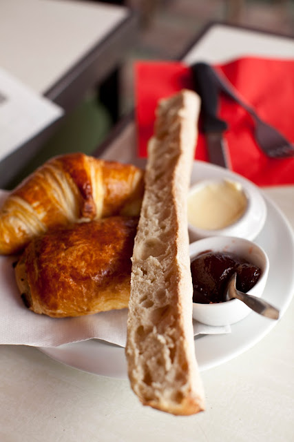 Quite generous portion of half a bread stick, a croissant, jam, butter, coffee, orange juice and an omelet (I forgot to photograph it, but it was quite large).